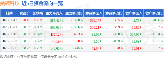 证券之星消息,截至2025年11月12日收盘,美硕科技(301295)报收于28.1元,上涨0.29%,换手率5.24%,成交量1.54万手,成交额4324.14万元。