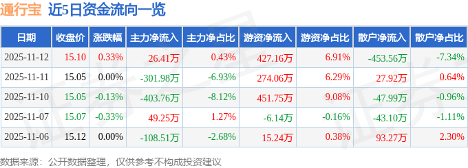 证券之星消息,截至2025年11月12日收盘,通行宝(301339)报收于15.1元,上涨0.33%,换手率2.44%,成交量4.09万手,成交额6180.8万元。