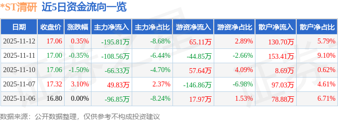 证券之星消息,截至2025年11月12日收盘,*ST清研(301288)报收于17.06元,上涨0.35%,换手率1.68%,成交量1.31万手,成交额2255.53万元。