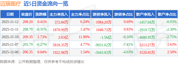 证券之星消息,截至2025年11月12日收盘,迈瑞医疗(300760)报收于208.2元,上涨0.41%,换手率0.62%,成交量7.49万手,成交额15.72亿元。