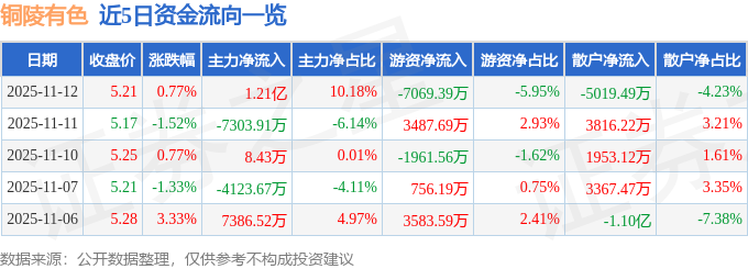 证券之星消息,截至2025年11月12日收盘,铜陵有色(000630)报收于5.21元,上涨0.77%,换手率2.05%,成交量228.24万手,成交额11.88亿元。