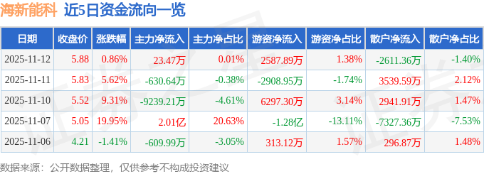 证券之星消息,截至2025年11月12日收盘,海新能科(300072)报收于5.88元,上涨0.86%,换手率13.64%,成交量318.07万手,成交额18.72亿元。
