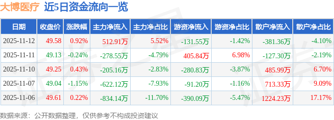 证券之星消息,截至2025年11月12日收盘,大博医疗(002901)报收于49.58元,上涨0.92%,换手率0.65%,成交量1.87万手,成交额9294.73万元。
