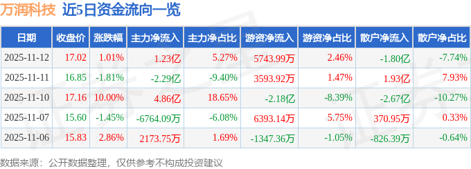 证券之星消息,截至2025年11月12日收盘,万润科技(002654)报收于17.02元,上涨1.01%,换手率16.41%,成交量138.72万手,成交额23.3亿元。