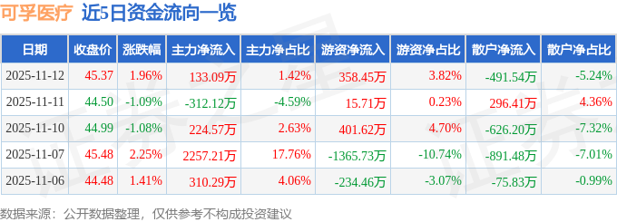 11月12日的资金流向数据方面,主力资金净流入133.09万元,占总成交额1.42%,游资资金净流入358.45万元,占总成交额3.82%,散户资金净流出491.54万元,占总成交额5.24%。