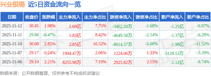 证券之星消息,截至2025年11月12日收盘,兴业银锡(000426)报收于30.45元,上涨1.98%,换手率3.81%,成交量67.65万手,成交额20.6亿元。