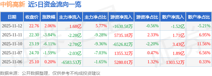 证券之星消息,截至2025年11月12日收盘,中钨高新(000657)报收于22.76元,上涨2.06%,换手率8.83%,成交量127.53万手,成交额29.17亿元。