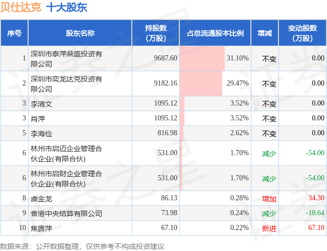 根据贝仕达克2025年三季报公布的十大股东详情如下: