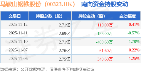 证券之星消息,11月12日南向资金增持110.0万股马鞍山钢铁股份(00323.HK)。近5个交易日中,获南向资金减持的有2天,累计净减持112.4万股。近20个交易日中,获南向资金增持的有12天,累计净增持16.8万股。截至目前,南向资金持有马鞍山钢铁股份(00323.HK)2.71亿股,占公司已发行普通股的15.6%。