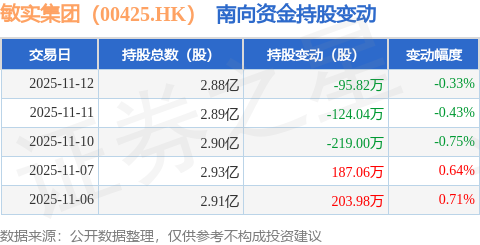 证券之星消息,11月12日南向资金减持95.82万股敏实集团(00425.HK)。近5个交易日中,获南向资金减持的有3天,累计净减持47.82万股。近20个交易日中,获南向资金减持的有12天,累计净减持1311.7万股。截至目前,南向资金持有敏实集团(00425.HK)2.88亿股,占公司已发行普通股的24.48%。