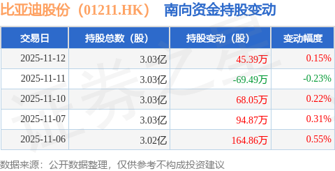 证券之星消息,11月12日南向资金增持45.39万股比亚迪股份(01211.HK)。近5个交易日中,获南向资金增持的有4天,累计净增持303.68万股。近20个交易日中,获南向资金增持的有12天,累计净增持965.86万股。截至目前,南向资金持有比亚迪股份(01211.HK)3.03亿股,占公司已发行普通股的8.22%。