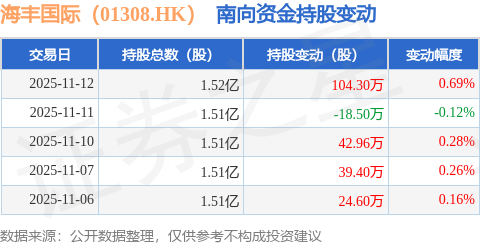 证券之星消息,11月12日南向资金增持104.3万股海丰国际(01308.HK)。近5个交易日中,获南向资金增持的有4天,累计净增持192.76万股。近20个交易日中,获南向资金减持的有11天,累计净减持271.88万股。截至目前,南向资金持有海丰国际(01308.HK)1.52亿股,占公司已发行普通股的5.63%。