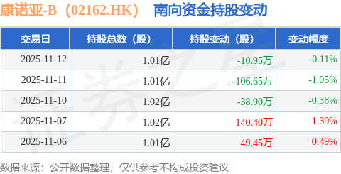 证券之星消息,11月12日南向资金减持10.95万股康诺亚-B(02162.HK)。近5个交易日中,获南向资金增持的有2天,累计净增持33.35万股。近20个交易日中,获南向资金减持的有15天,累计净减持681.73万股。截至目前,南向资金持有康诺亚-B(02162.HK)1.01亿股,占公司已发行普通股的33.65%。