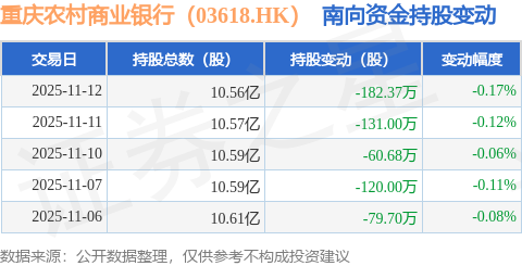证券之星消息,11月12日南向资金减持182.37万股重庆农村商业银行(03618.HK)。近5个交易日中,获南向资金减持的有5天,累计净减持573.76万股。近20个交易日中,获南向资金增持的有10天,累计净增持3219.24万股。截至目前,南向资金持有重庆农村商业银行(03618.HK)10.56亿股,占公司已发行普通股的41.99%。