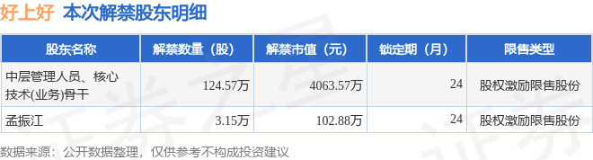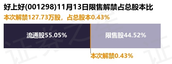 证券之星消息,根据市场公开信息整理,好上好(001298)于11月13日将有127.73万股限售股份解禁,为公司股权激励限售股份,占公司总股本0.43%。(本次数据根据历史公告整理得出,实际情况以上市公司最新公告为准)最近一年内,该股累计解禁931.74万股,占总股本的3.14%。本次解禁后,公司还有1.32亿股限售股份,占总股本44.52%。具体如下图所示:
