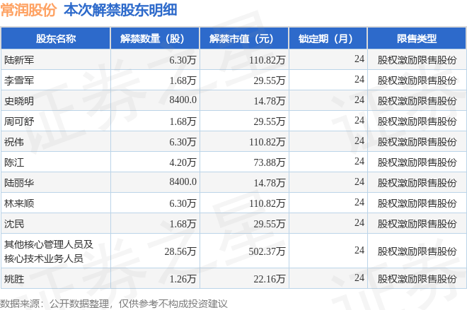 证券之星消息,根据市场公开信息整理,常润股份(603201)于11月13日将有59.64万股限售股份解禁,为公司股权激励限售股份,占公司总股本0.31%。(本次数据根据历史公告整理得出,实际情况以上市公司最新公告为准)最近一年内,该股累计解禁1.1亿股,占总股本的58.09%。本次解禁后,公司还有181.02万股限售股份,占总股本0.95%。具体如下图所示: