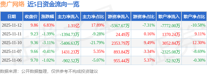 证券之星消息,截至2025年11月12日收盘,贵广网络(600996)报收于9.86元,上涨6.83%,换手率5.92%,成交量73.77万手,成交额7.35亿元。