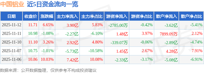 证券之星消息,截至2025年11月12日收盘,中国铝业(601600)报收于11.71元,上涨6.65%,换手率4.44%,成交量584.62万手,成交额66.92亿元。