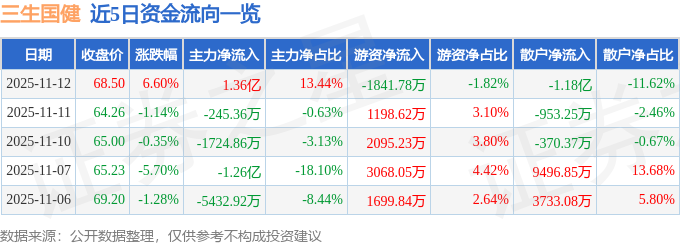 证券之星消息,截至2025年11月12日收盘,三生国健(688336)报收于68.5元,上涨6.6%,换手率2.41%,成交量14.87万手,成交额10.14亿元。