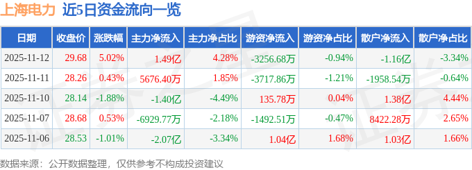 证券之星消息,截至2025年11月12日收盘,上海电力(600021)报收于29.68元,上涨5.02%,换手率4.29%,成交量120.96万手,成交额34.68亿元。