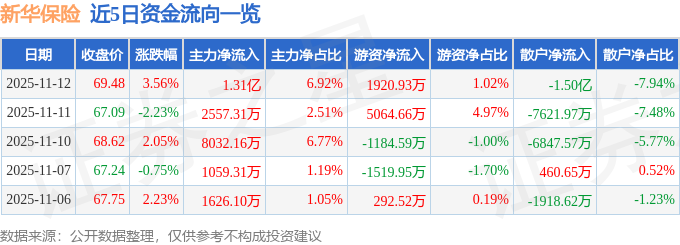 证券之星消息,截至2025年11月12日收盘,新华保险(601336)报收于69.48元,上涨3.56%,换手率1.31%,成交量27.35万手,成交额18.87亿元。