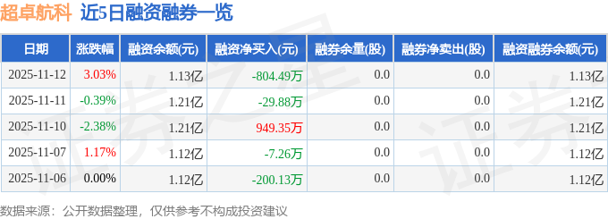 超卓航科融资融券信息显示,融资方面,当日融资买入634.74万元,融资偿还1439.23万元,融资净偿还804.49万元。融券方面,融券卖出0.0股,融券偿还0.0股,融券余量0.0股,融券余额0.0万元。融资融券余额1.13亿元。