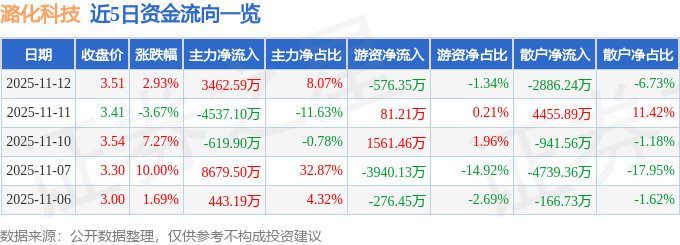 11月12日的资金流向数据方面,主力资金净流入3462.59万元,占总成交额8.07%,游资资金净流出576.35万元,占总成交额1.34%,散户资金净流出2886.24万元,占总成交额6.73%。