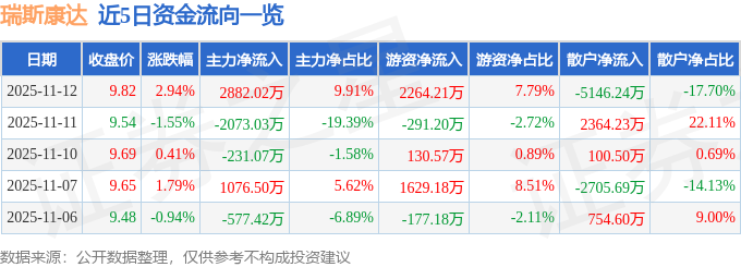 证券之星消息,截至2025年11月12日收盘,瑞斯康达(603803)报收于9.82元,上涨2.94%,换手率6.97%,成交量29.62万手,成交额2.91亿元。