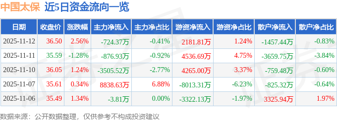 证券之星消息,截至2025年11月12日收盘,中国太保(601601)报收于36.5元,上涨2.56%,换手率0.71%,成交量48.54万手,成交额17.63亿元。
