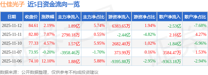 11月12日的资金流向数据方面,主力资金净流入1.89亿元,占总成交额5.74%,游资资金净流入6383.65万元,占总成交额1.94%,散户资金净流出2.53亿元,占总成交额7.68%。