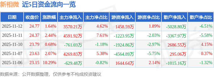 证券之星消息,截至2025年11月12日收盘,新相微(688593)报收于24.77元,上涨1.64%,换手率9.65%,成交量31.14万手,成交额7.72亿元。