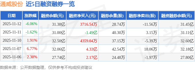通威股份融资融券信息显示,融资方面,当日融资买入6.35亿元,融资偿还5.98亿元,融资净买入3716.54万元。融券方面,融券卖出1.94万股,融券偿还13.5万股,融券余量28.74万股,融券余额721.37万元。融资融券余额31.45亿元。