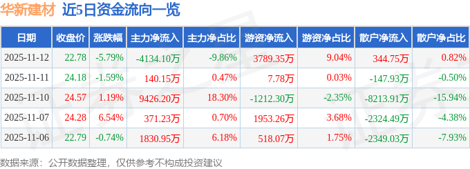 证券之星消息,截至2025年11月12日收盘,华新建材(600801)报收于22.78元,下跌5.79%,换手率1.35%,成交量18.1万手,成交额4.19亿元。