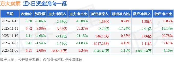 证券之星消息,截至2025年11月12日收盘,方大炭素(600516)报收于6.38元,下跌5.06%,换手率7.69%,成交量309.47万手,成交额19.78亿元。