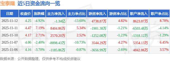 证券之星消息,截至2025年11月12日收盘,宝泰隆(601011)报收于4.25元,下跌4.92%,换手率12.0%,成交量229.97万手,成交额9.82亿元。