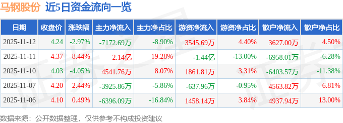 证券之星消息,截至2025年11月12日收盘,马钢股份(600808)报收于4.24元,下跌2.97%,换手率3.17%,成交量189.02万手,成交额8.06亿元。