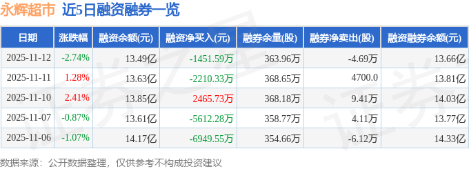 永辉超市融资融券信息显示,融资方面,当日融资买入3363.37万元,融资偿还4814.96万元,融资净偿还1451.59万元。融券方面,融券卖出2.17万股,融券偿还6.86万股,融券余量363.96万股,融券余额1677.88万元。融资融券余额13.66亿元。