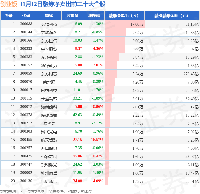 创业板融券净卖出前三分别为:长信科技(300088)融券净卖出17万股、宋城演艺(300144)融券净卖出9.04万股、东方国信(300166)融券净卖出8.6万股,前20具体见下表: