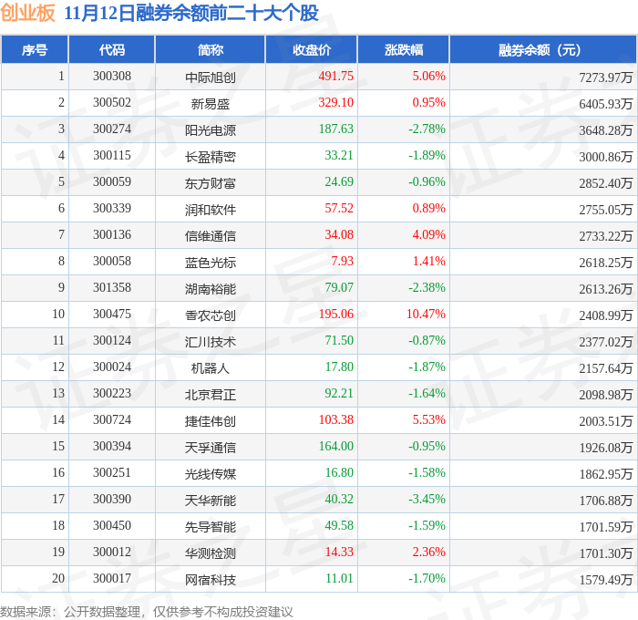 创业板融券余额前三分别为:中际旭创(300308)融券余额7273.97万元、新易盛(300502)融券余额6405.93万元、阳光电源(300274)融券余额3648.28万元,前20具体见下表: