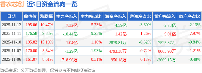 证券之星消息,截至2025年11月12日收盘,香农芯创(300475)报收于195.06元,上涨10.47%,换手率15.57%,成交量69.35万手,成交额127.73亿元。
