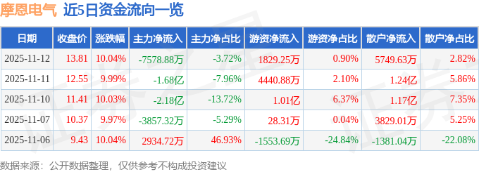 证券之星消息,截至2025年11月12日收盘,摩恩电气(002451)报收于13.81元,上涨10.04%,已连续涨停7天,换手率34.88%,成交量153.16万手,成交额20.38亿元。