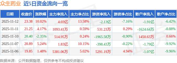 证券之星消息,截至2025年11月12日收盘,众生药业(002317)报收于23.38元,上涨10.02%,涨停,换手率17.65%,成交量134.42万手,成交额29.69亿元。