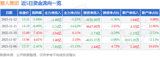 证券之星消息,截至2025年11月12日收盘,雪人集团(002639)报收于13.31元,下跌5.6%,换手率30.66%,成交量199.49万手,成交额26.71亿元。