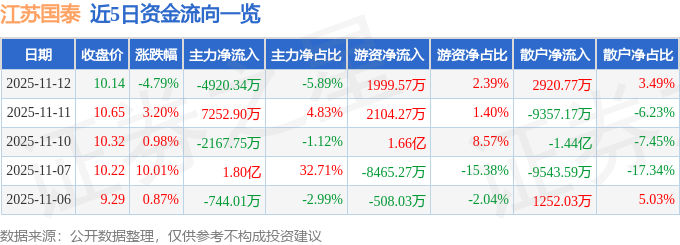 证券之星消息,截至2025年11月12日收盘,江苏国泰(002091)报收于10.14元,下跌4.79%,换手率5.15%,成交量82.28万手,成交额8.36亿元。