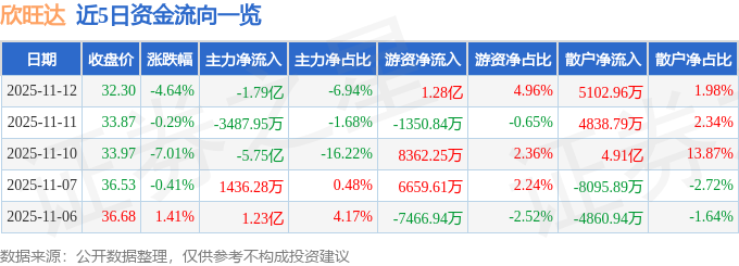 证券之星消息,截至2025年11月12日收盘,欣旺达(300207)报收于32.3元,下跌4.64%,换手率4.62%,成交量79.26万手,成交额25.75亿元。