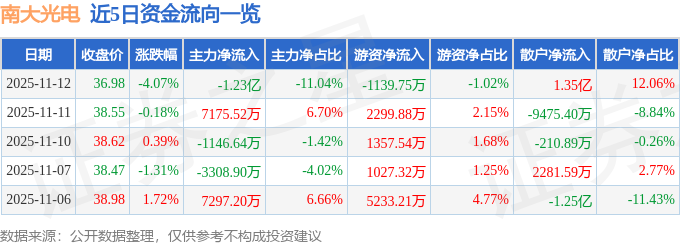 证券之星消息,截至2025年11月12日收盘,南大光电(300346)报收于36.98元,下跌4.07%,换手率4.56%,成交量29.96万手,成交额11.16亿元。