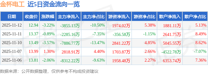 证券之星消息,截至2025年11月12日收盘,金杯电工(002533)报收于12.94元,下跌3.22%,换手率4.43%,成交量28.24万手,成交额3.67亿元。