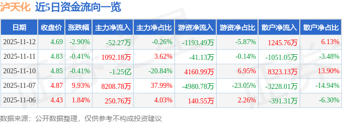 证券之星消息,截至2025年11月12日收盘,泸天化(000912)报收于4.69元,下跌2.9%,换手率2.75%,成交量43.14万手,成交额2.03亿元。
