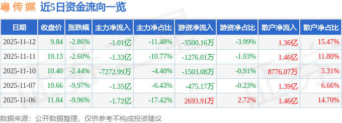证券之星消息,截至2025年11月12日收盘,粤 传 媒(002181)报收于9.84元,下跌2.86%,换手率7.82%,成交量88.72万手,成交额8.78亿元。