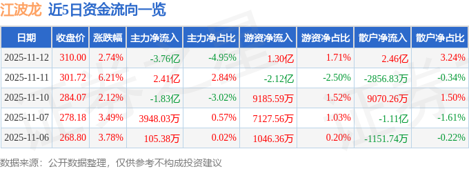 11月12日的资金流向数据方面,主力资金净流出3.76亿元,占总成交额4.95%,游资资金净流入1.3亿元,占总成交额1.71%,散户资金净流入2.46亿元,占总成交额3.24%。